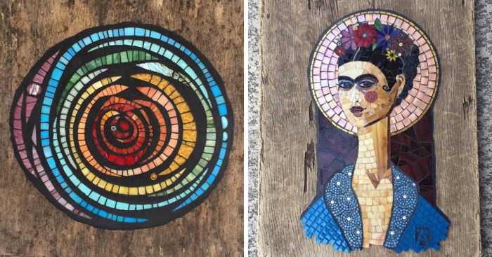 I have always loved this idea of taking something discarded and giving it a new life so it is no wonder that the majority of my art is created from things found in the trash or washed up on a beach. I am a mosaic artist who currently lives in Huntington Beach, CA. As an avid beach comber, I have found a lot of what I use washed up on shore at my local beach but I have also found many things in neighborhood trash bins or remodeling project dumpsters. From old windows, random pieces of board, old skateboards and found frames, my substrates can be found everywhere and I always see their future potential where some only see trash. Sometimes a piece of wood will have old rusty nails in it. I purposely leave them as is and incorporate into the piece I create. It is my small way of reducing the amount of trash we create, a way to up-cycle and a challenge to myself and others to look beyond what we perceive to be..just trash.