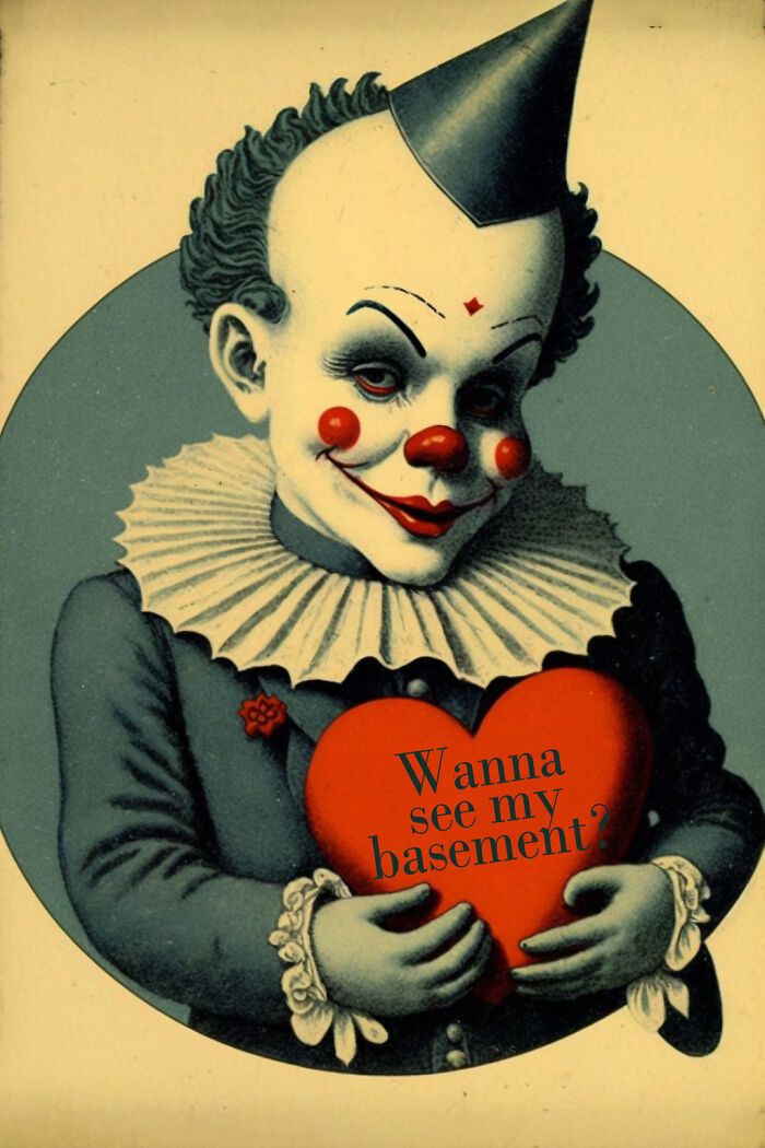 To start, I used Midjourney to create a variety of different designs. I narrowed down the results to my favorite images, a total of 32! Then I broke them down further into packs of 8. Sorted into the themes of witches, monsters, clowns, and of course stalkers! I then used Photoshop to add additional details and make the designs look more polished. They had a lot of jumbled words and extra fingers…creepy but not the kind of creepy that I was looking for. For each image, I came up with a saying to add. Some of them are leaning towards adult humor, while others feature a standard Valentine's message. I wanted to make sure that the messages had enough variety that there would be something spooky, humorous, or generic depending on who the recipient would be.