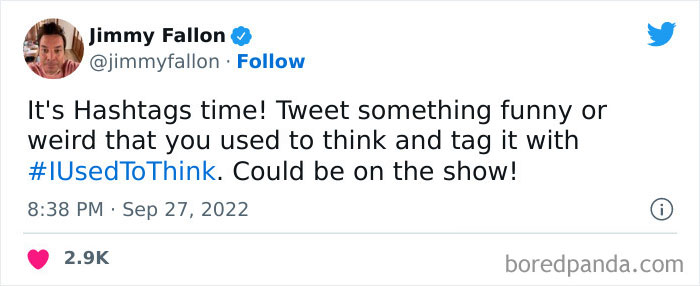 “Tweet something funny or weird that you used to think and tag it with #IUsedToThink,” Fallon announced on Twitter before sharing his own story. “I used to think that if I turned on the light in the back seat while the car was moving, we would get pulled over by the police and my parents would go to jail for 50 years,” he recounted.