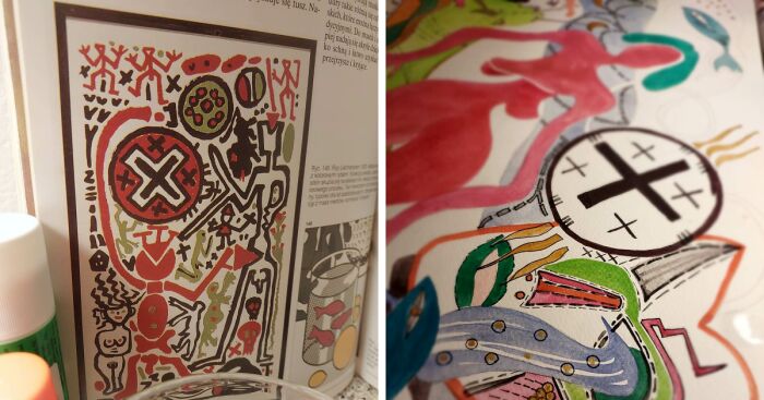You can see the artist’s painting on the first photo. Next, the photo shows the painting under the influence of the inspiration of his idea. This is really a different idea and a different reflection.