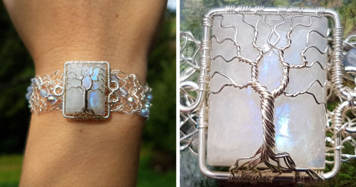 I wrapped the tree onto the stone and crocheted the bracelet part. The wire I use for crocheting is 0.3 mm