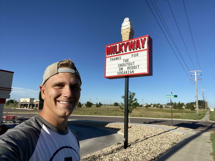 Somehow the ice cream shop must've learned about their new fame online, and they put up a sign to personally thank SoDakZak. "That had to be the most wholesome exciting thing to happen to me during the pandemic, and from there I told myself that I would try to continue supporting the business at minimum once per sign change," he said. "I kept posting and people on Reddit continued to enjoy their jokes and puns. I don't really have a plan on stopping, it's really not an inconvenience to me since I work across the street for the foreseeable future, building homes for people in our family business."