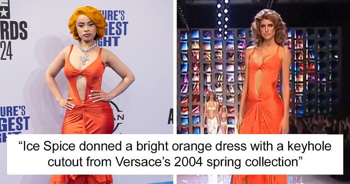 Ice Spice donned a bright orange dress with a keyhole cutout from Versace’s 2004 spring collection