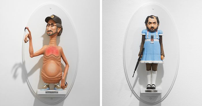 American visual artist Mike Leavitt is a huge movie fan. To honor his favourite directors, Mike carved 16 wooden figures. However, their shapes are rather unusual, because the artist merged famous movie makers with iconic characters from their films.