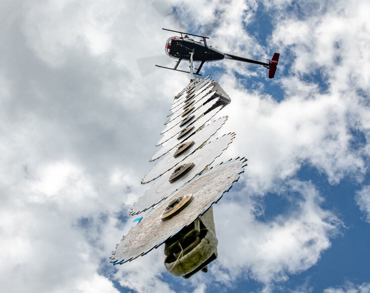 Trimming trees with 10 circular saws attached to a metal bar, dangling from a helicopter.