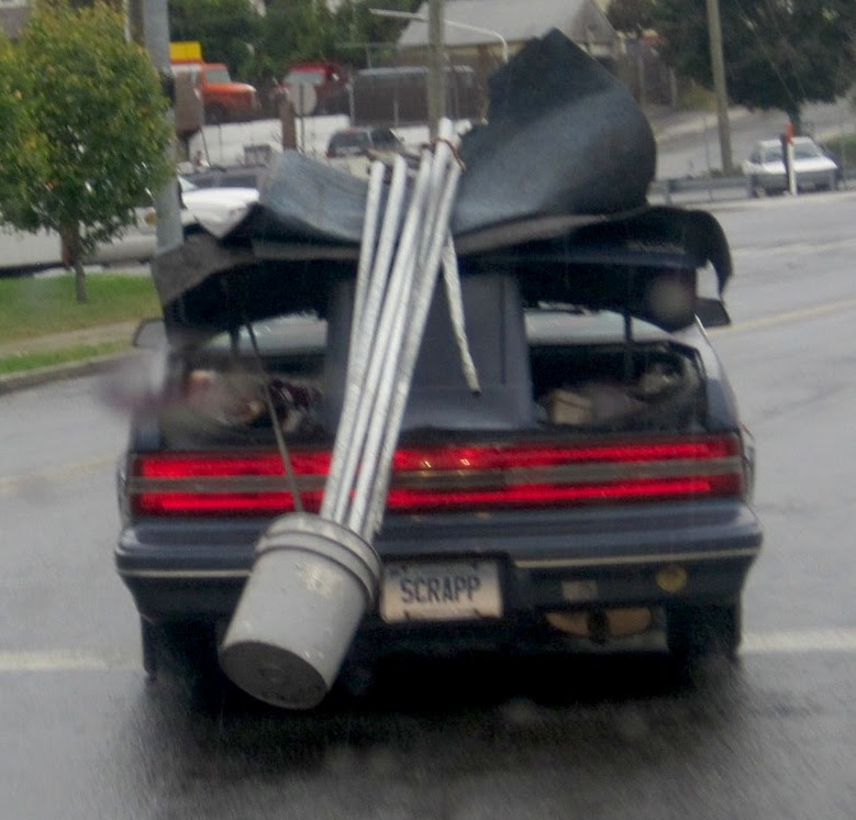 Almost looks like a junk yard car. There is a local junk yard that had a couple of cars in really bad shape that ran but were missing various parts. They used them just in their own yard when they were driving out to the back to bring some engine or part back up to the front. In other words, basically motorized carts. But they didn't take those cars on the public roads.