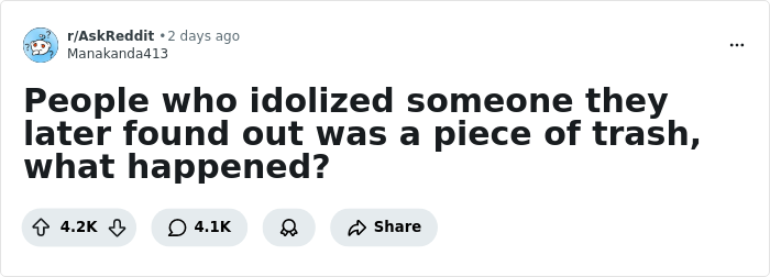 Sometimes, we forget that nobody's perfect. We hear an album that speaks to our heart, so we decide to learn more about the artist who made it, and three days of binge-watching their interviews later, we set the picture as our phone screen, convinced they can do no wrong. But there's a reason they say you need to separate the person from the craft. Actually, a bunch of reasons. And they're listed on this Reddit thread where disappointed fans reveal how they learned about their idols' dark side.