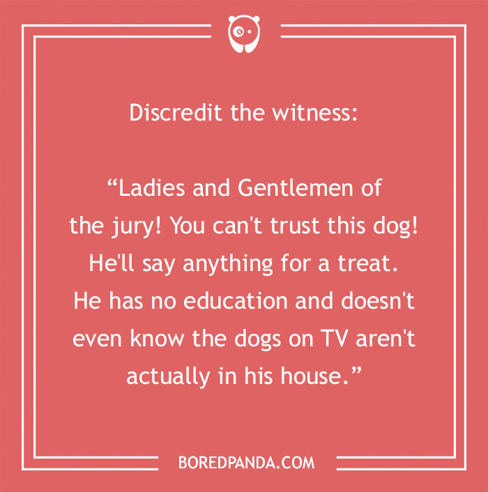 'Ladies and Gentlemen of the jury! You can't trust this dog! He'll say anything for a treat. He has no education and doesn't even know the dogs on TV aren't actually in his house.'"