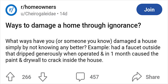 Reddit user u/Cheirogaleidae sparked a discussion on the r/homeowners online community when they asked everyone about the ways that they’ve damaged their homes through sheer ignorance. We’ve collected the best stories and tips so that you avoid these errors, Pandas.