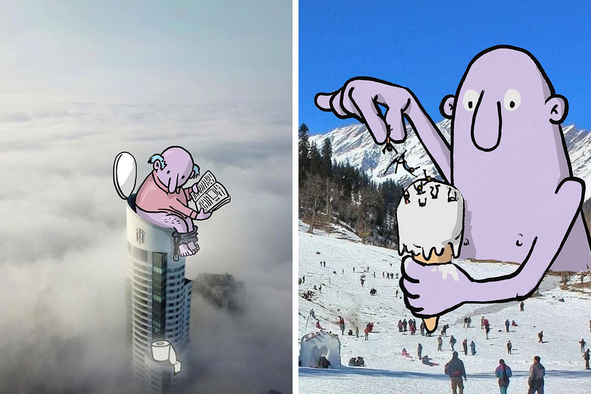 A Brazilian illustrator, filmmaker, photographer, and art director, Lucas has many talents. However, this time, we would like to update you on his funny project 'Photo Invasion', where the artist literally invades other people's photos with fitting illustrations, usually portraying cartoon characters partaking in silly things.