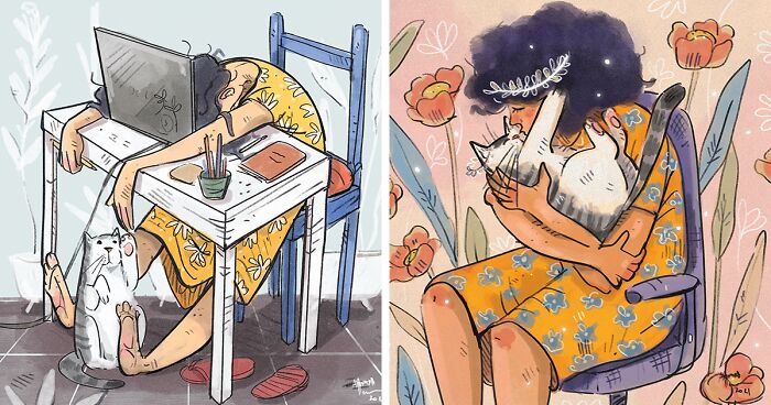 I wish these illustrations were inspired by my life with a cat. Currently, I am just manifesting the dream of having a floof at home. I am a cat lover. The apartment space I reside in in India has a satisfying number of cats. My friend who is a core cat person is their caretaker and she has plenty of cats of her own at home. She has always been an inspiration to imagine life with a cat at home. Her stories, my whimsical style, and my hint of humor just helped me mold these memories into illustrations. So the perks and realistic vibe in the illustrations may be a figment of my imagination but it comes from a lot of love and the experience of others.