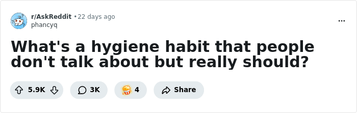 Someone recently asked, "What's a hygiene habit that people don't talk about but really should?" and people didn't hold back. They shared a mix of tips, some (seemingly) obvious and others that might surprise you. From washing behind your ears, to cleaning your belly button, soaking dog leashes once a week, and using a soap that actually suits your body chemistry...