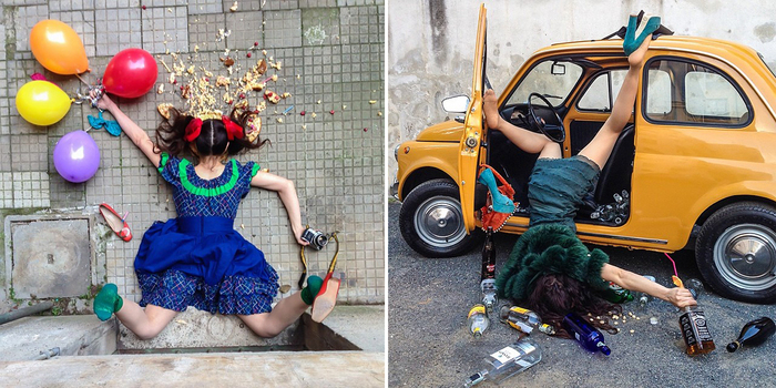 Photographer Sandro Giordoan has created a hilarious photo series of people who look like they’ve just taken terrible falls, spilling all their stuff around them in a “yard sale” of sorts.