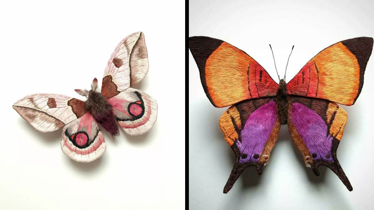 Yumi Okita, a Japanese artist, creates stunning embroidered fiber sculptures of butterflies and moths, often as large as your face, which is both mesmerizing and slightly terrifying. As Yumi herself shares, she’s drawn to nature’s paradoxes, where beauty is interwoven with elements that are eerie and even grotesque—a feeling she captures perfectly in her intricate works.