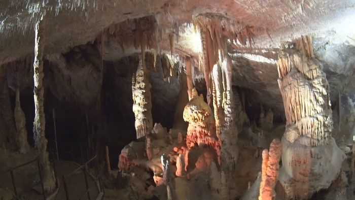 Postojna Cave is a 24,340 m long karst cave system near Postojna, southwestern Slovenia. Postojna Cave was carved by the Pivka River over millions of years. There are stalagmites, stalactites, and formations called curtains or draperies that look like folded curtains.
