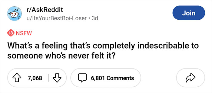 So when one Reddit user asked everyone on the platform to share a feeling they believe is indescribable to someone who hasn't had it, people immediately started submitting their answers, highlighting the complexity of human interaction.
