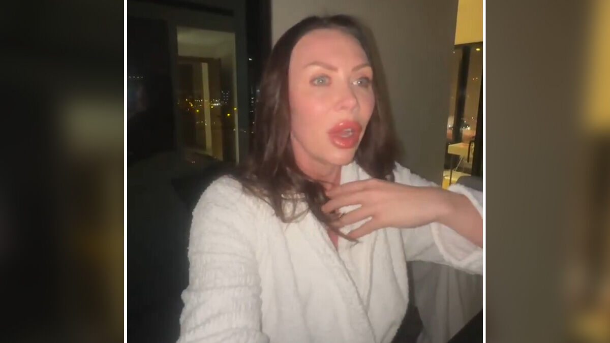 Influencer in a white robe filming herself indoors amid Iran's Dubai strikes, sparking public fury over entitlement behavior.