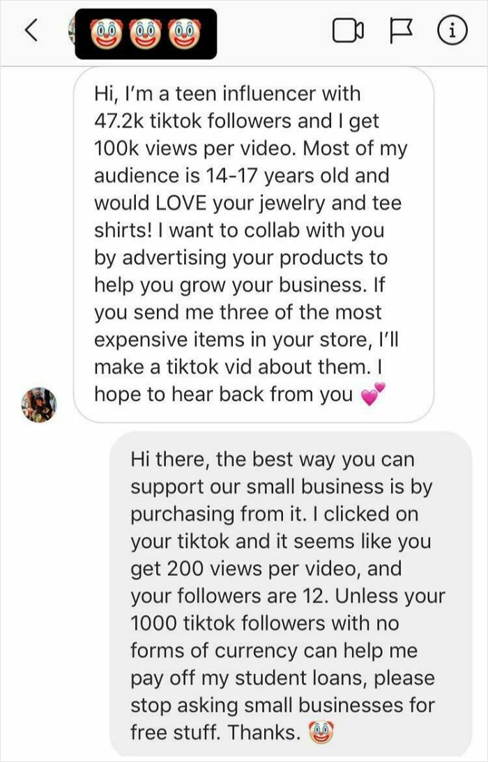 I Get A Lot Of Dms Daily From Teen TikTok “Stars” Asking For Free Stuff From My Business, And Here’s An Example