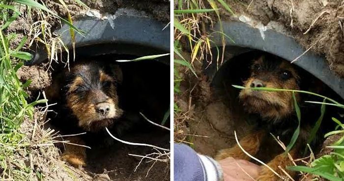 The doggie ran into a ditch covered with a stone. “When I was finally able to move the stone and put my hand slowly in there… she smelled it and then put her paws on my hand.”