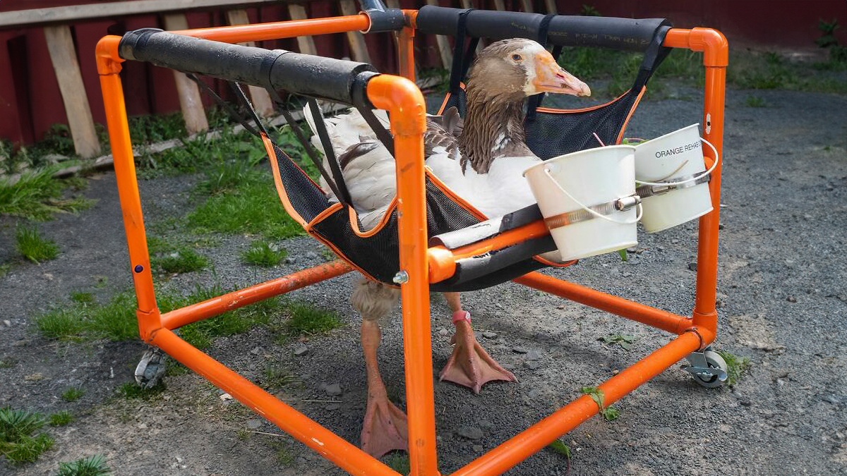 One day Zeus woke up unable to walk due to a serious spinal injury, yet Marina, the sanctuary’s physical therapist, crafted a special wheelchair for the goose