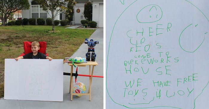 My eyes were barely open the next morning. He runs in and said, “Mom! I’m ready. Let’s set up my lemonade stand.” I told him I would be up after my coffee and for him to pick out the toys he wanted to give away. He then mentioned that he already had done that. And there in the kitchen were 8 of his toys and a few books. Some were his favorite toys. I walked out there, looked at them and my eyes watered. He really wanted to do this. It was the 1st thing on his heart that morning. He was ready. He then looked at me a little sad and said, “Aw. But I don’t have a sign Mom.” I explained that I had a poster board in the garage and would help him make one. He was super pumped after I brought it out. He then asked me to help him spell the words, but he wanted to write, what he wanted to write. I asked him what he wanted it to say and with the biggest smile, he told me… “Cheer up kids!!! Come to Blake Work’s house! We have free toys for you!!” My eyes started tearing up again as I spelled out each word for him. He was smiling from ear to ear. It meant everything to him. As he drew the little hearts, I knew that his heart truly was just exploding to do this.