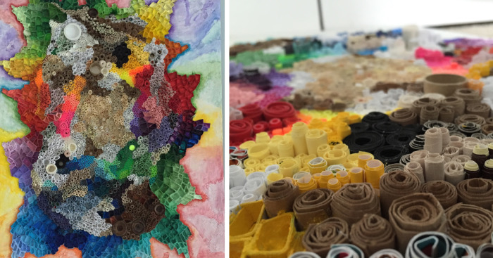 Ear plugs, used painters tape, acorns, magazines, expired coupons, cardboard shipping material, old elastic, sushi grass, popped balloon animals, Brita filter directions, used paper towels and Trader Joe’s grocery bags is just the start of what I used to make this creation. I quilled and glued down all the pieces.
