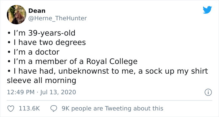 Dean is a 39-year-old doctor with two degrees, is a member of a Royal College, and had a sock up their shirt sleeve all morning. This is so relatable that the thread went viral on Twitter, getting over 113k likes and 7.3k retweets and comments.