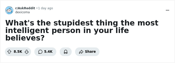 In this thread on AskReddit, the user u/dexicoma asked netizens a couple of days ago: "What's the stupidest thing the most intelligent person in your life believes?" The question has already collected over 9.3K upvotes with nearly 6K various comments. And we, Bored Panda, are presenting to you a selection of the most interesting and intriguing stories.