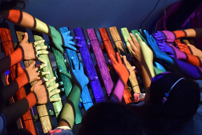 What is music like when you can’t hear it? Colombian interactive artist, Daniel Escobar Vásquez, created an interactive installation called Marimba Inclusiva that helps deaf people feel the music. In this case, a marimba de chonta, a traditional instrument from Colombia’s Pacific coast, acts as an interface, which allows deaf people to experience sound through vibrations. Thanks to a combination of sensors and colorful educative video mapping projections, any deaf person can feel the rhythm and learn to play the instrument.