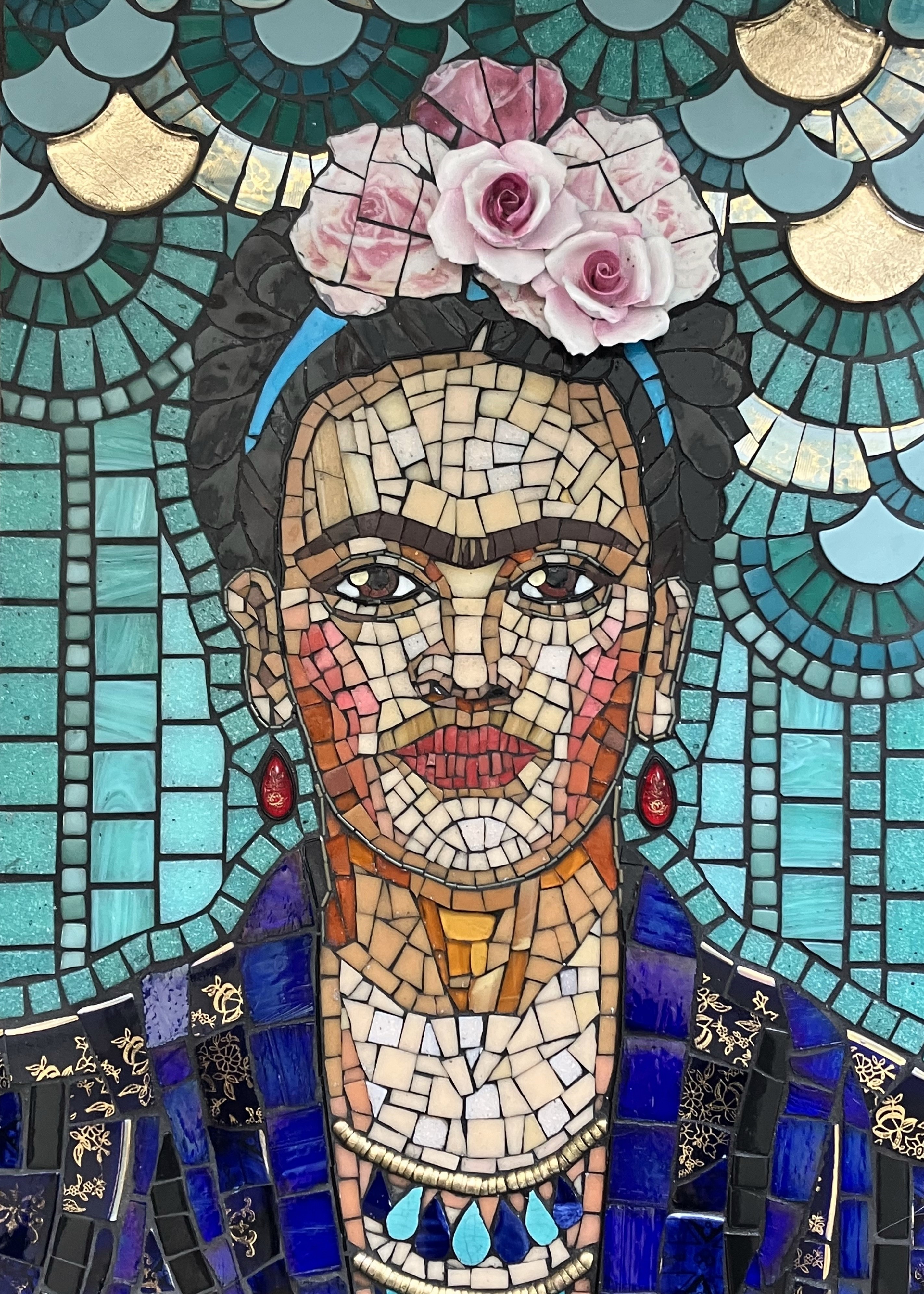 Man showcasing a creative stained glass artwork of a colorful hobbit house outdoors, highlighting creative projects.