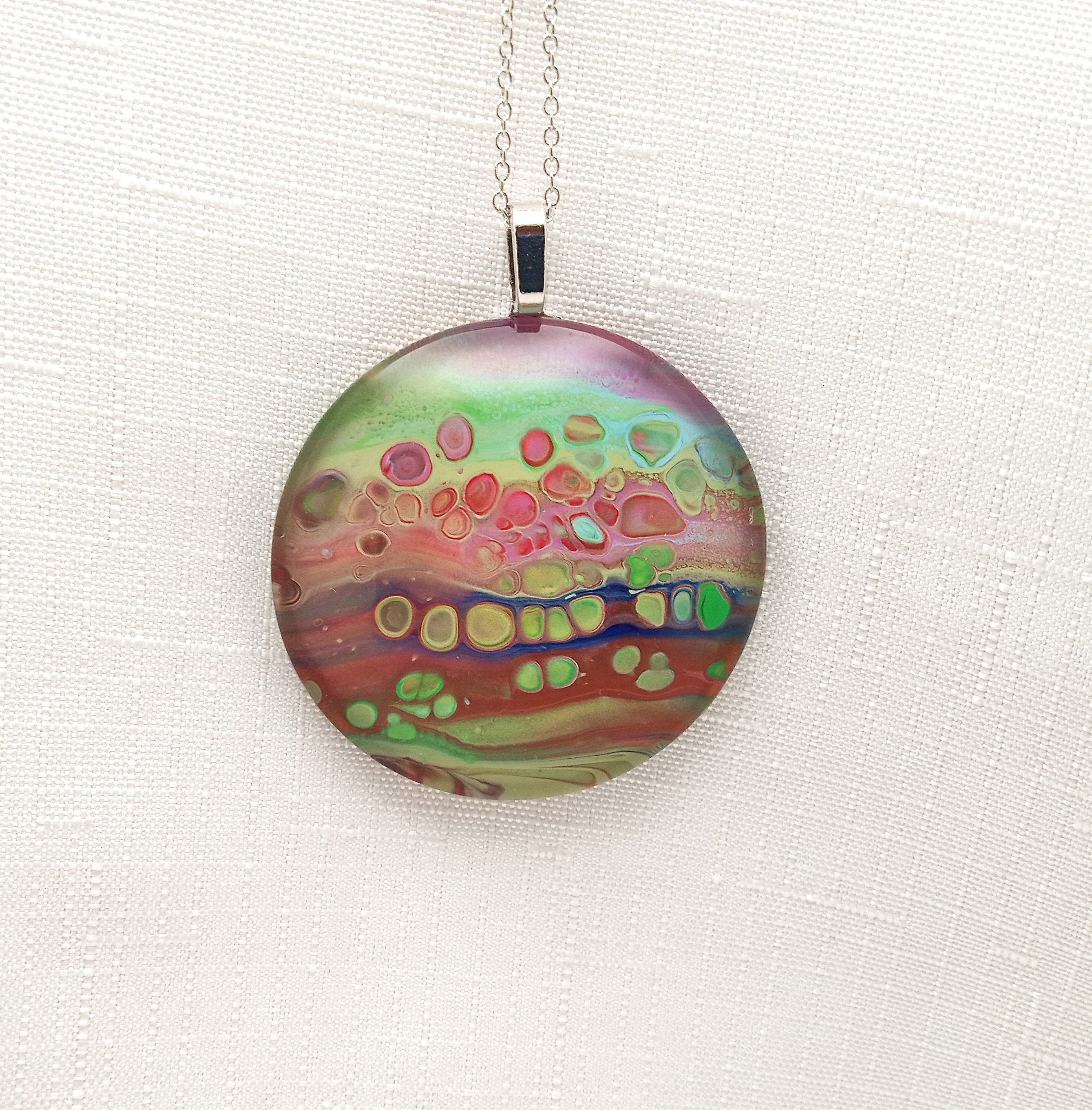 Hand holding a multi-colored stone next to a leather piece with polished decorative stones showcasing creative projects.