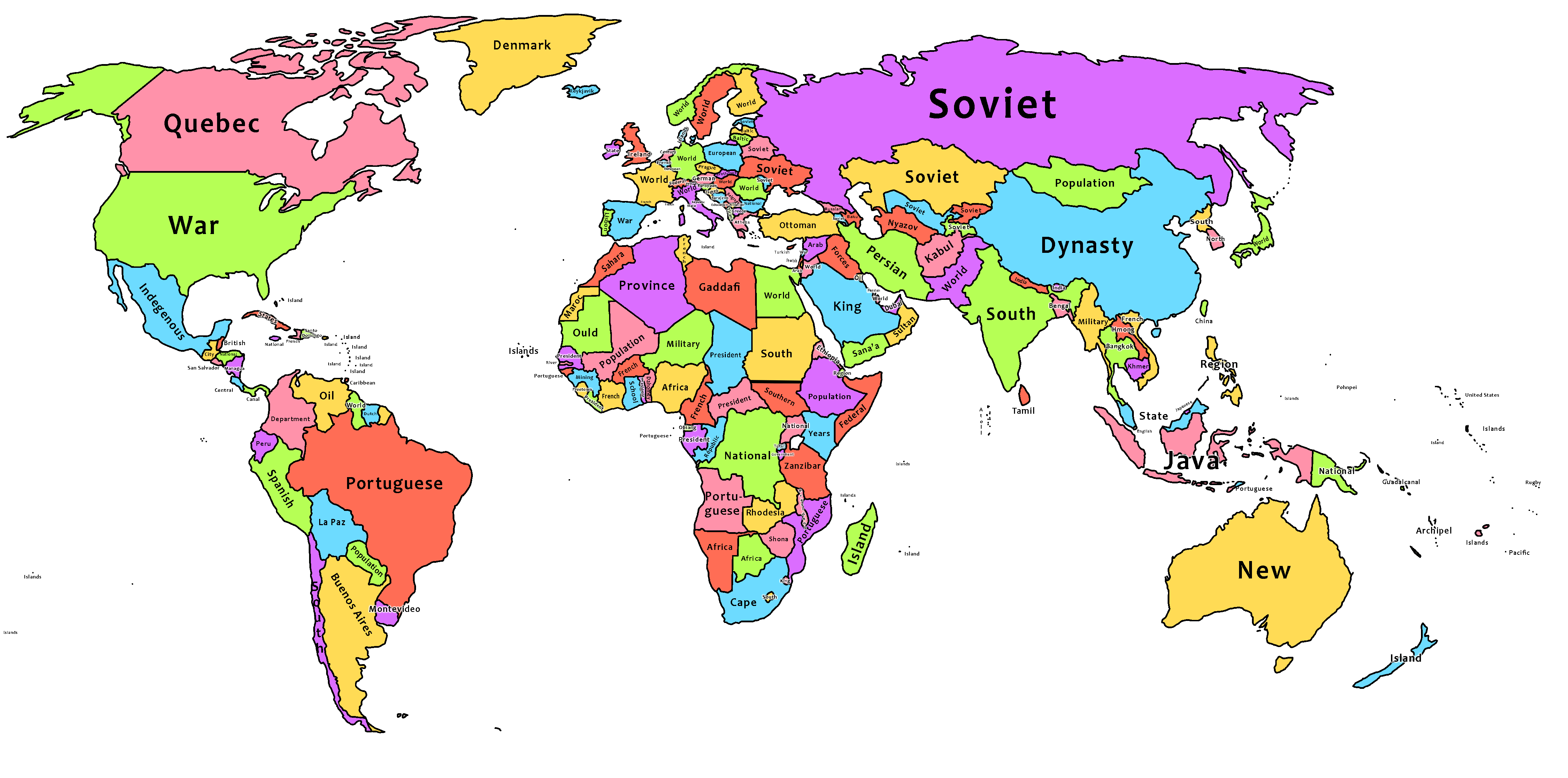 I think it is about the most common word on the country's Wikipedia page (which is about history and culture in most cases)
