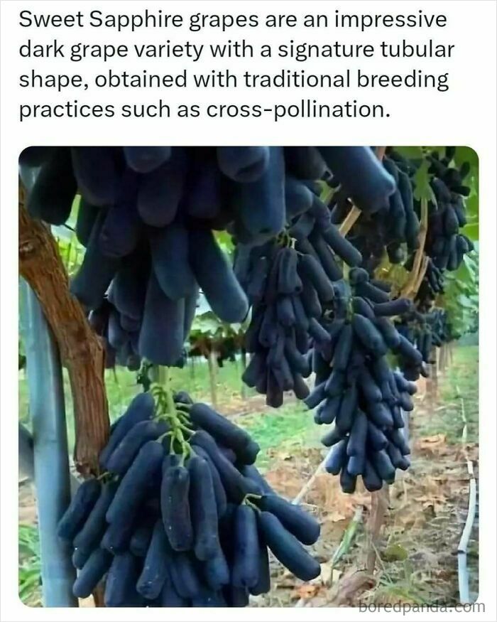 Sweet Sapphire grapes, also known as Moon Drop grapes, are a dark grape variety with a tubular shape and dark purple skin. They are seedless, have a translucent green flesh, and are very sweet. Sweet Sapphire grapes are so firm that they can be snapped in half, and they can be stuffed. They were first developed in California in 2004 using traditional breeding practices such as cross-pollination.