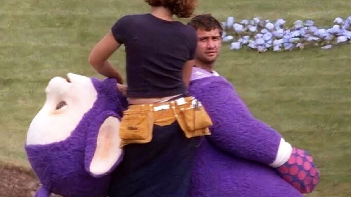 Behind the scenes from the British television show, Telletubbies, which originally aired from 1997 to 2001. In real life, the Telletubbies were actually very tall. The oldest, purple Teletubby, Tinky Winky, stood at 10 feet tall (305 cm). The red Teletubby, Po, was 6 feet 6 (198 cm) inches tall. The yellow Teletubby, Laa-Laa, was 6 feet 5 inches (196 cm). The green Teletubby, Dipsy, was 8 feet (244 cm). The show was filmed on an incredibly large set to create the illusion that the Telletubbies were small. The location of the set was so secret that visitors had to be blindfolded. Eventually, word got out and it became known that a sloping hill on a private field in Wimpstone, Warwickshire in England was the home to "Tubbytronic Superdome". After the show ended, tourists began to flock to the iconic set. The landowners became fed up with trespassers, stating that "it was never meant to be a tourist attraction. We had people jumping fences, crossing cattle fields and all sorts..." They ultimately decided to flood the entire set and it has now been underwater for nearly two decades. The set is now occupied by a family of swans and freshwater fish.