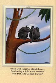 I had to look it up. Chimp picks a hair off another chimp saying "well, well, another blonde hair. Conducting a little more 'research' with that Jane Goodall tramp?"