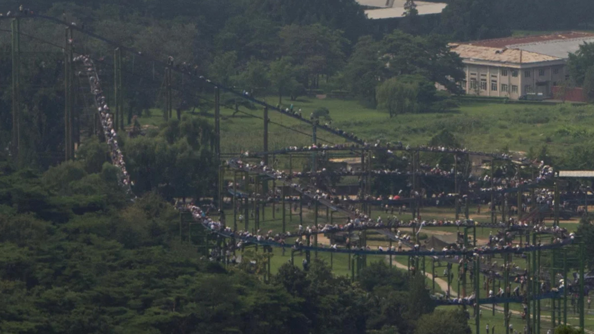 This Photo Taken By A Western Tourist Shows Hundreds Of People On Top Of A Roller Coaster In North Korea. It's Still Unclear What Exactly They're Doing