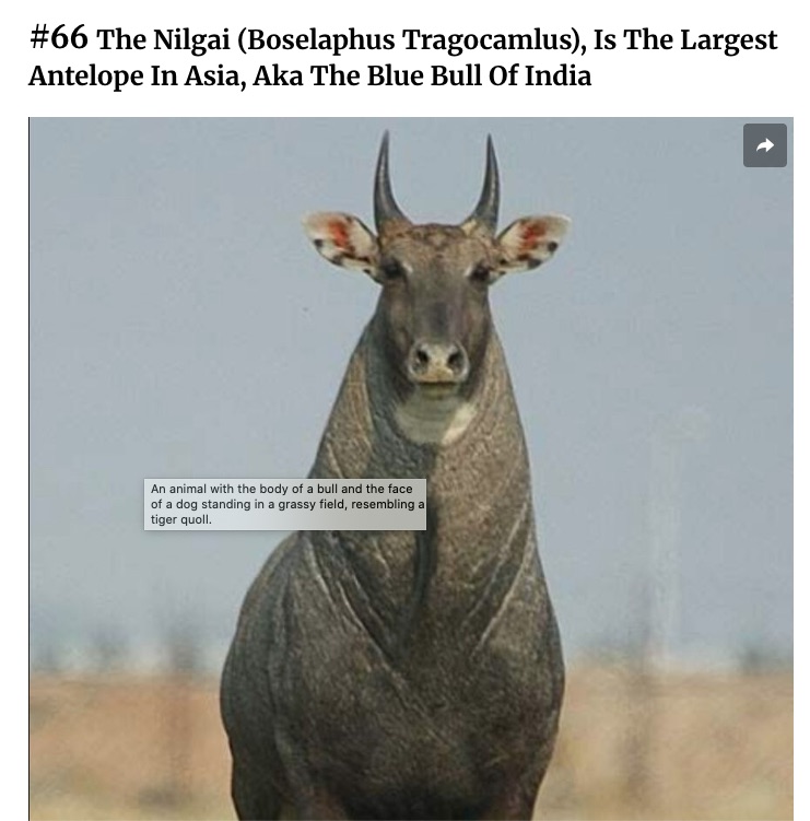 OK, my favourite one yet -> "An animal with the body of a bull and the face of a dog standing in a grassy field, resembling a tiger quoll."