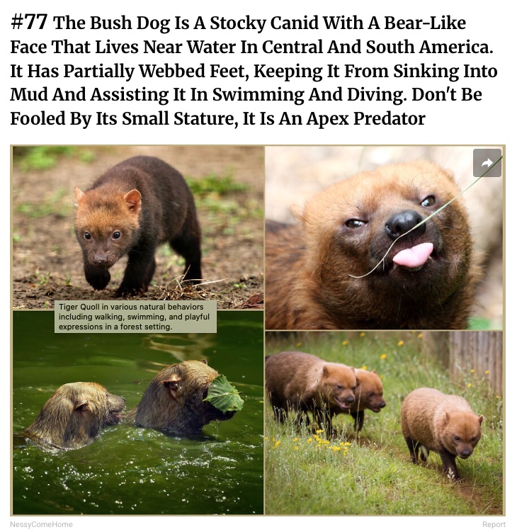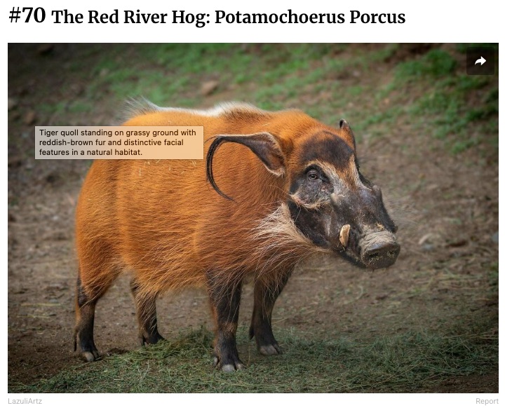 Interesting. SEO (Search Engine Optimization) keyword. The new software hypothesis might have been about right. The AI is peppering the entries with references to Tiger Quolls to make it a more likely result when searching for Tiger Quolls on a search engine. The idea isn't bad, but the egxecution is terrible. Your site, or in this case just this article, would have to much competition trying using a generic search term like just "Animal" or even "Unique Animal"... but since most of these entries, in fact all but one, are NOT Tiger Quolls, there's a bit of a problem comparing everything to Tiger Quolls. But then again, I'm no successful SEO engineer, so maybe the answer IS all Tiger Quoll.