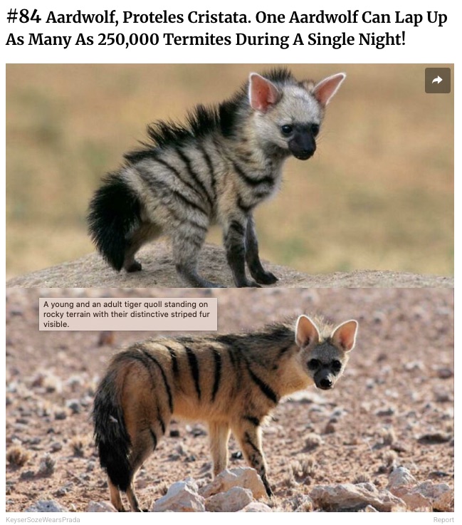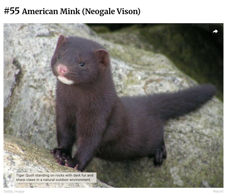 I feel like this list was captioned with all the finesse of the Dark Souls message system Is it a bird? No. Is it a fish, No. It's an animal, right? Yeh. Tiger Quoll.
