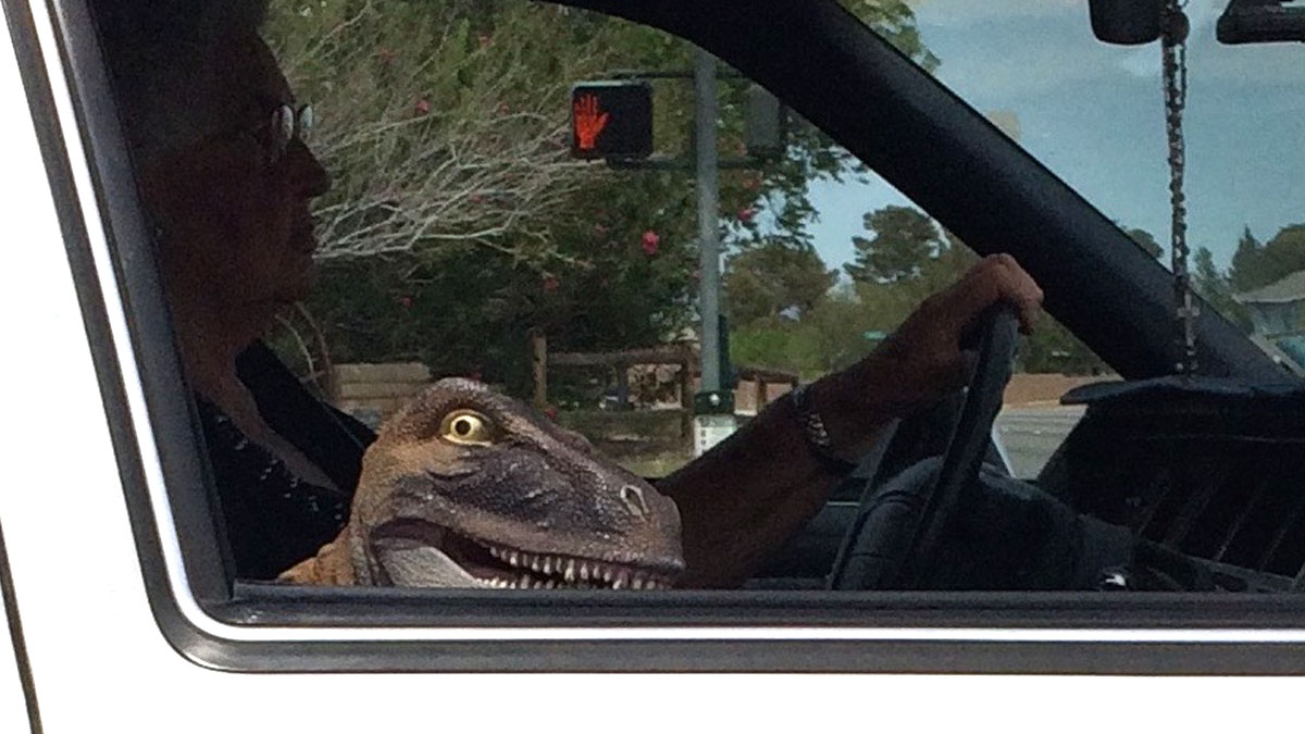 Stopped At A Red Light When Grandma Pulls Up With Her T-Rex Riding Shotty