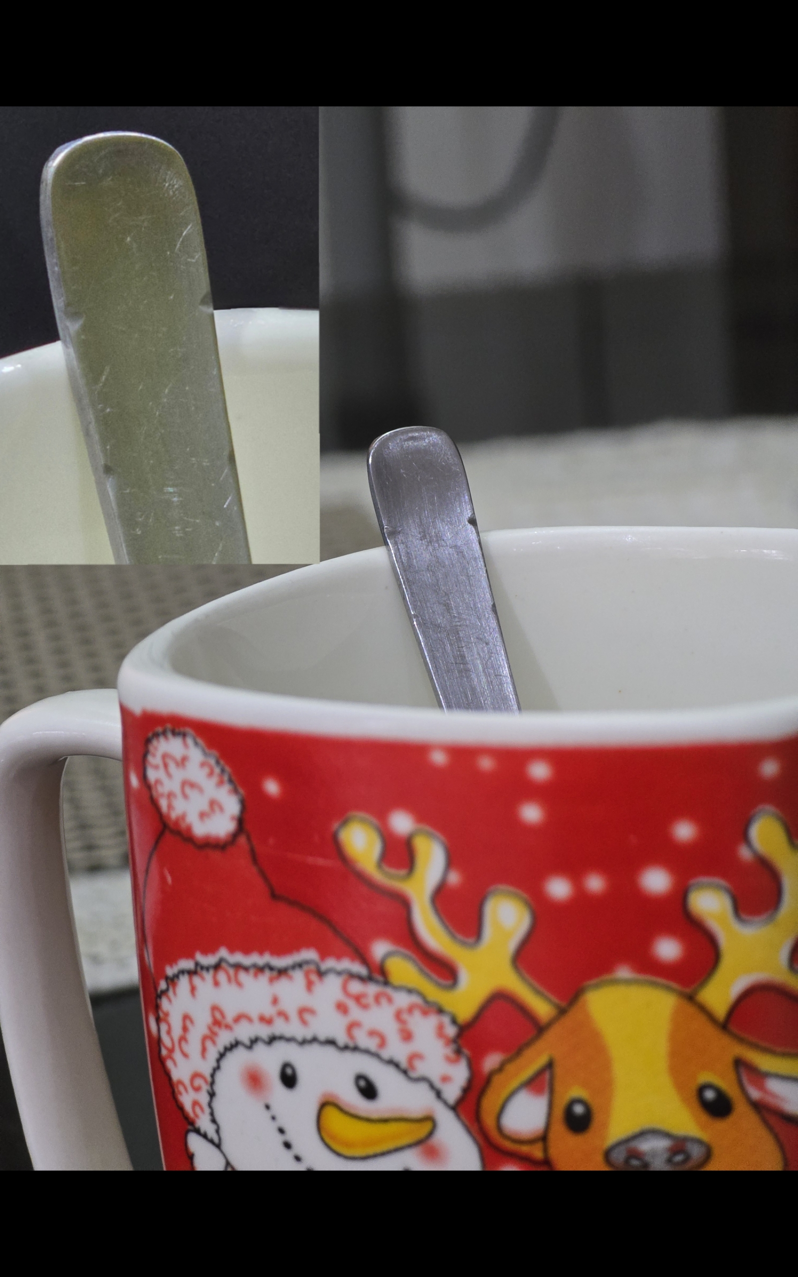 This is my tea spoon. Worn from rubbing against the rim of my mug. There are two separate pairs of the worn marks because my original mug fell and broke into pieces. 1000000326...081ac4.jpg