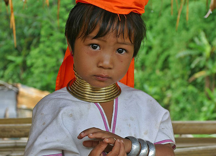 Girls of the Kayan tribe start wearing neck rings at around 5 years old. Over the years, the coil is replaced by a longer one and more turns are added. The rings can stretch their necks to a length of about 15 inches (38 cm).