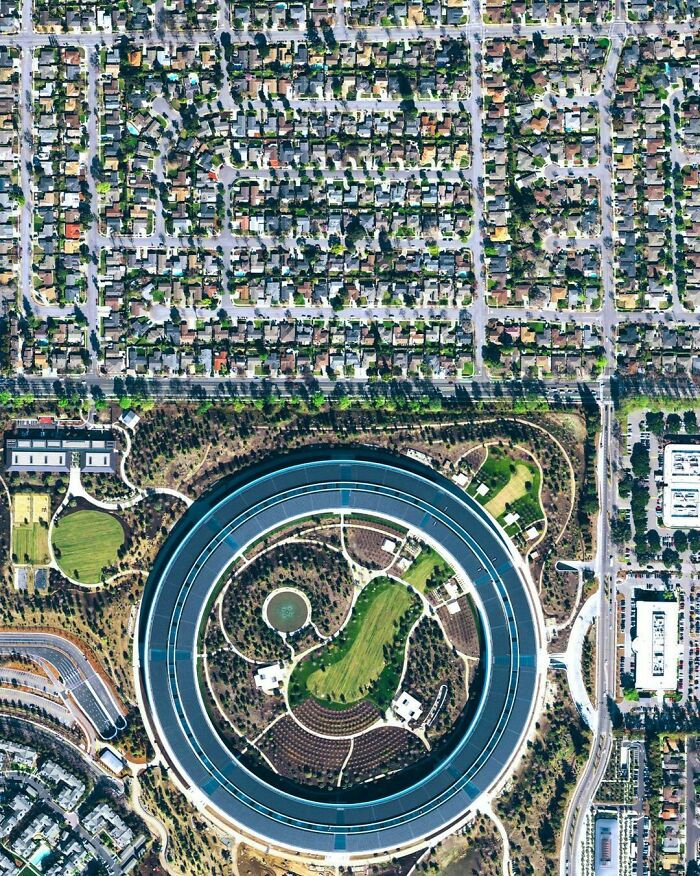 The corporate headquarters of Apple is named the Apple Park. It opened in 2017 and accommodates more than 12,000 employees within the 318,000 sqm office and laboratory space (80% of the campus is green space). However, it has more than 14,200 parking spaces covering an area of 325,000 sqm. Cupertino Parking Regulations required 11,000 parking spaces, while Apple provided 22% more parking than required. Apple Park has been heavily criticised for contributing to urban sprawl and car-dependency. Fortunately, Apple provides buses to the campus and offer bicycles to get around in the campus, and neighbours have seen an property value increase.