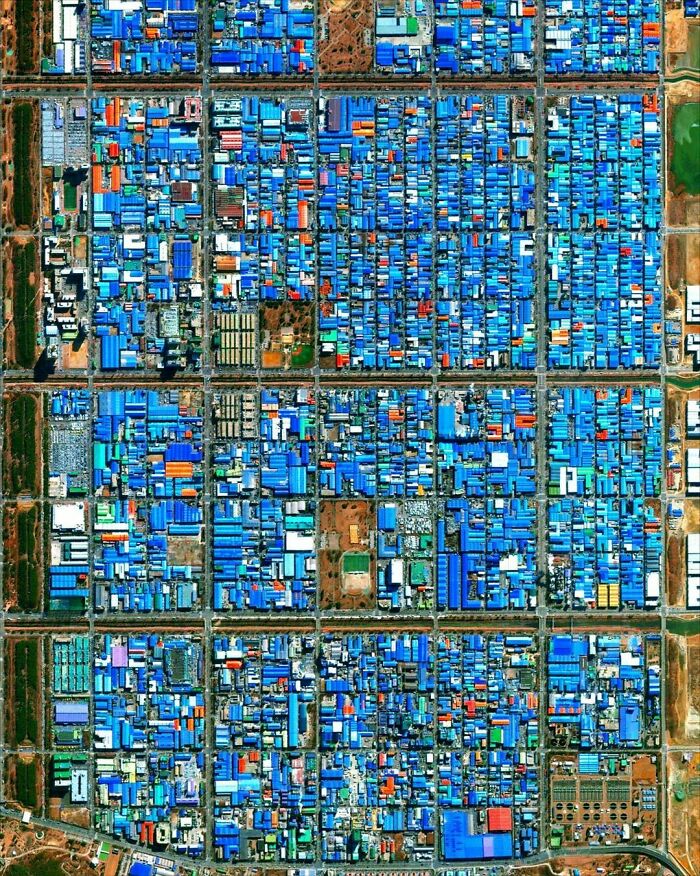 Siheung City has almost 500.000 inhabitants and is located northwest in the peninsula of South Korea. In the picture we see blue aluminium roofs spread over a vast area with industrial buildings. Traditionally colors have played a significant role in Korean history, and was often a indication for social status. Blue tile was a sign of high social status. Many got similar blue tiles for their roofs as part of the New Village Movement in the 1970s (modernisation of the rural area) initiated by the president. Today even the presidential residence completed in 1991, named blue house, has blue tiles.