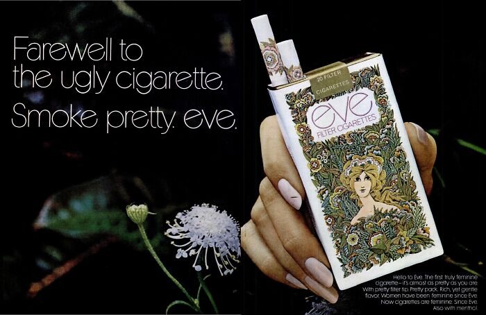 "Farewell To The Ugly Cigarette. Smoke Pretty. Eve." Eve Filter Cigarettes, 1971