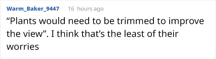Another wrote, “‘Plants would need to be trimmed to improve the view.’ I think that’s the least of their worries.”