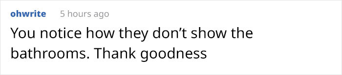 “You notice they don’t show the bathrooms. Thank goodness,” a fourth comment said.