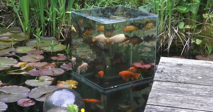 Fish are used to swimming underwater, but one guy decided to build an inverted aquarium and give them a chance to look around above the surface of their pond. The fish gathered quickly and appeared to be enjoying their new skyscraper.
