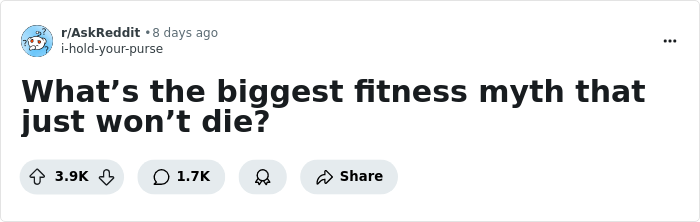The thread was started a little over a week ago in the AskReddit community by the user u/i-hold-your-purse, who asked netizens: "What’s the biggest fitness myth that just won’t die?" As of today, the thread has nearly 4K upvotes and 1.7K various comments. Moreover, in fact, a heated discussion arose over some of these myths - after all, some of the readers considered them not myths at all.