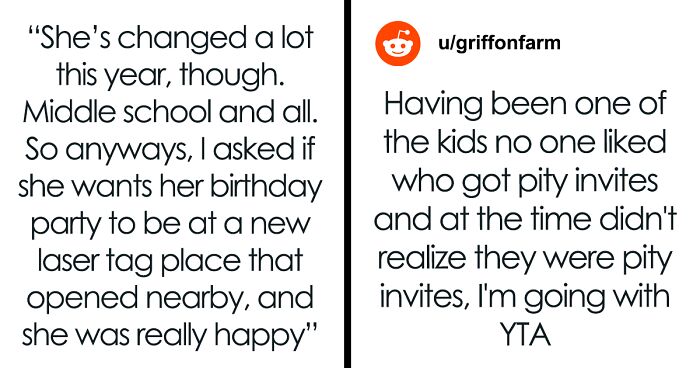 The post author received the ‘Not the A-hole’ badge but community members shared similar situations they have been through and had different memories. “In middle school (13 yo) I was a forced invitee to a popular girl’s b-day party. Had to invite the whole class, exactly like this. I was actually really happy. It just felt nice to be included for once, and I had a really great time,” one user remembered.